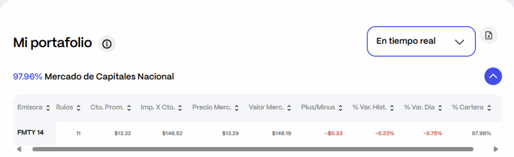 En esta primera aportación, logramos comprar 11 títulos de Fibra Monterrey (FMTY 14), con un costo promedio inicial de $13.32.